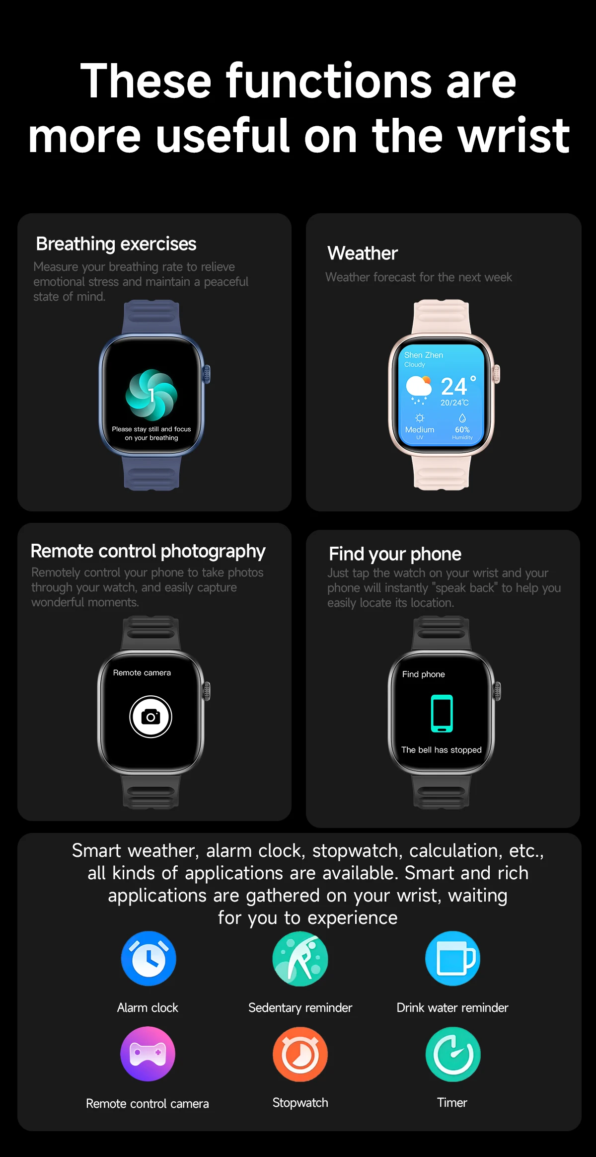 Smart weather, alarm clock, stopwatch, calculation, etc., all kinds of applications are available. Smart and rich applications are gathered on your wrist, waiting