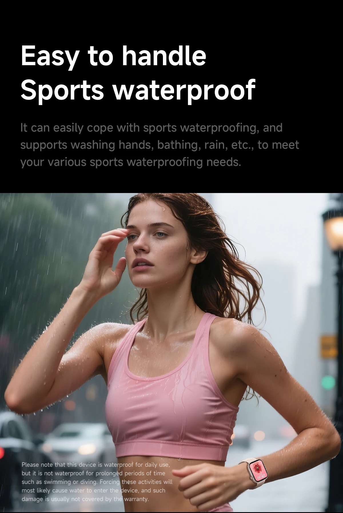 *Note:Please note that this device is waterproof for daily use, but it is not waterproof for prolonged periods of time such as swimming or diving. Forcing these activities will most likely cause water to enter the device, and such damage is usually not covered by the warranty.