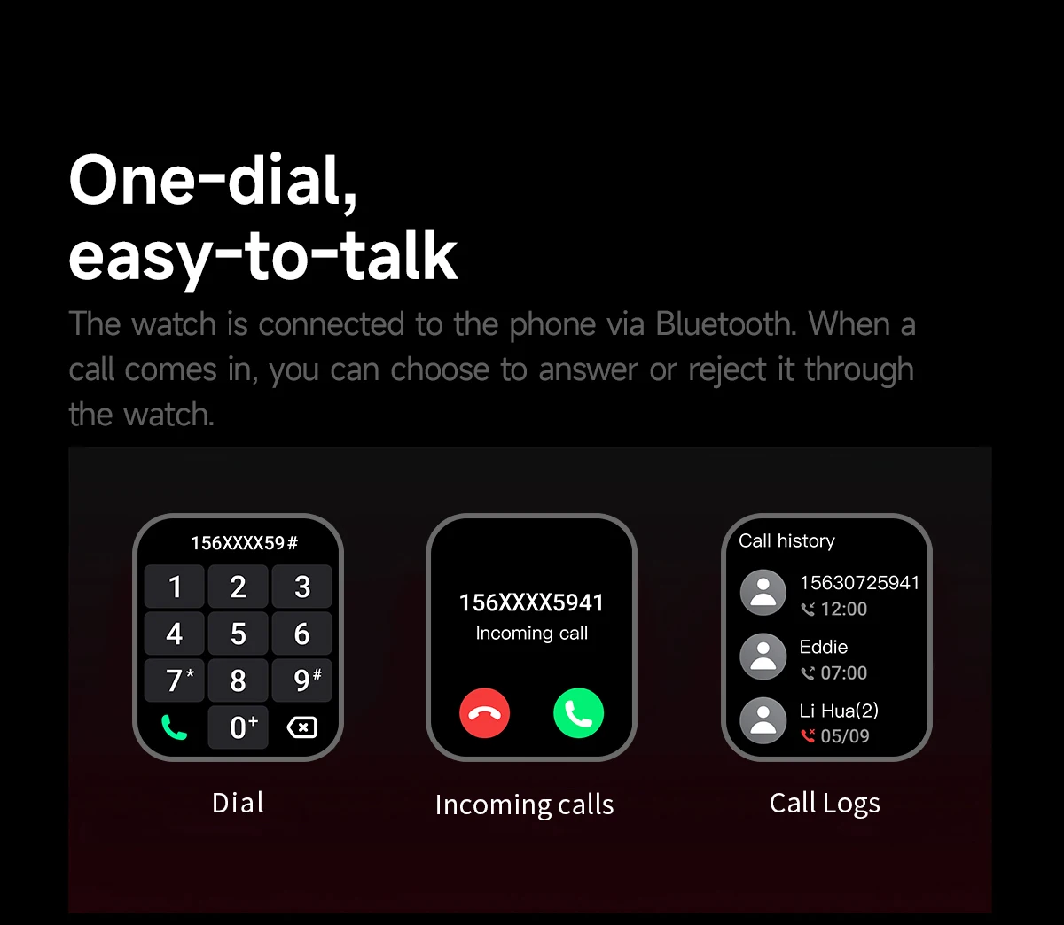 The watch is connected to the phone via Bluetooth. When a call comes in, you can choose to answer or reject it through the watch.