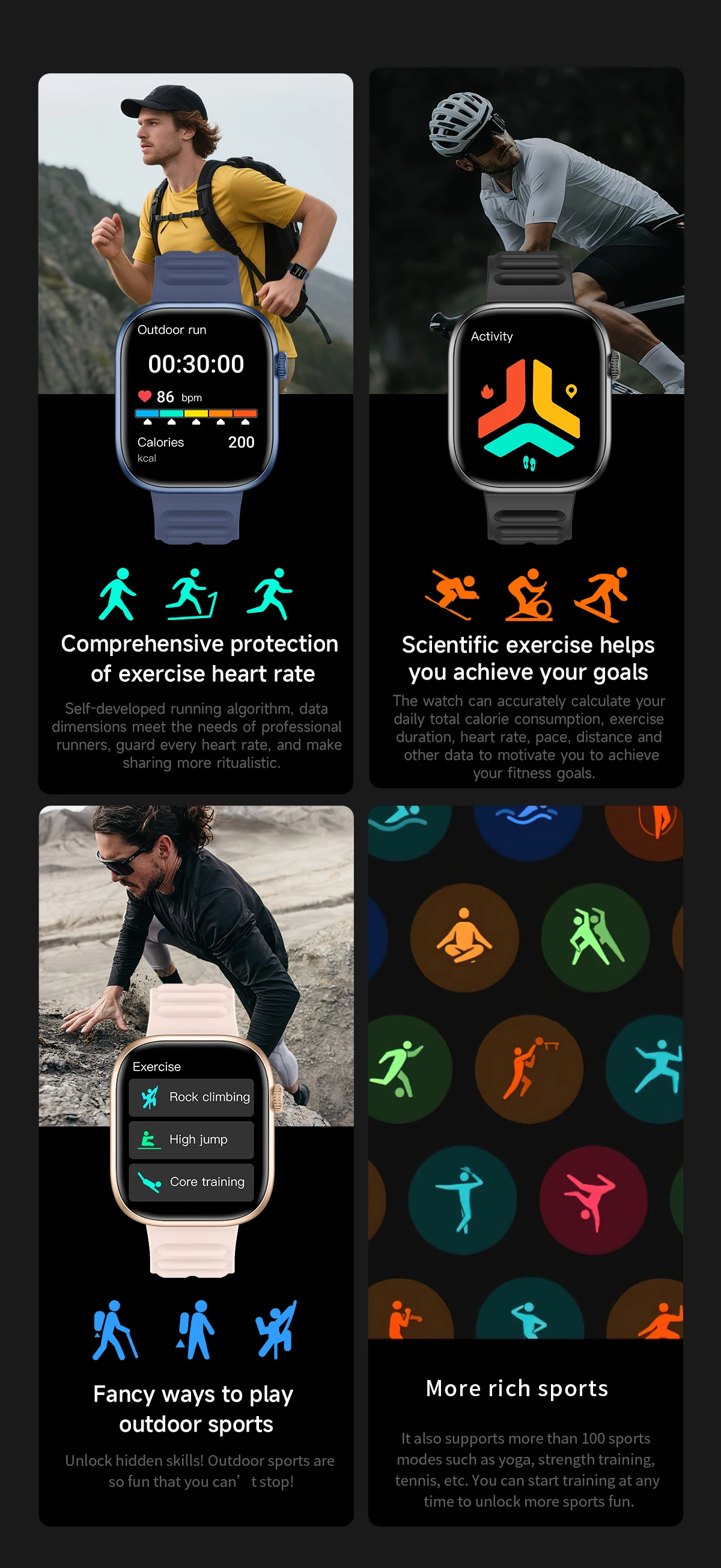 The watch can accurately calculate your daily total calorie consumption, exercise duration, heart rate, pace, distance and other data to motivate you to achieve