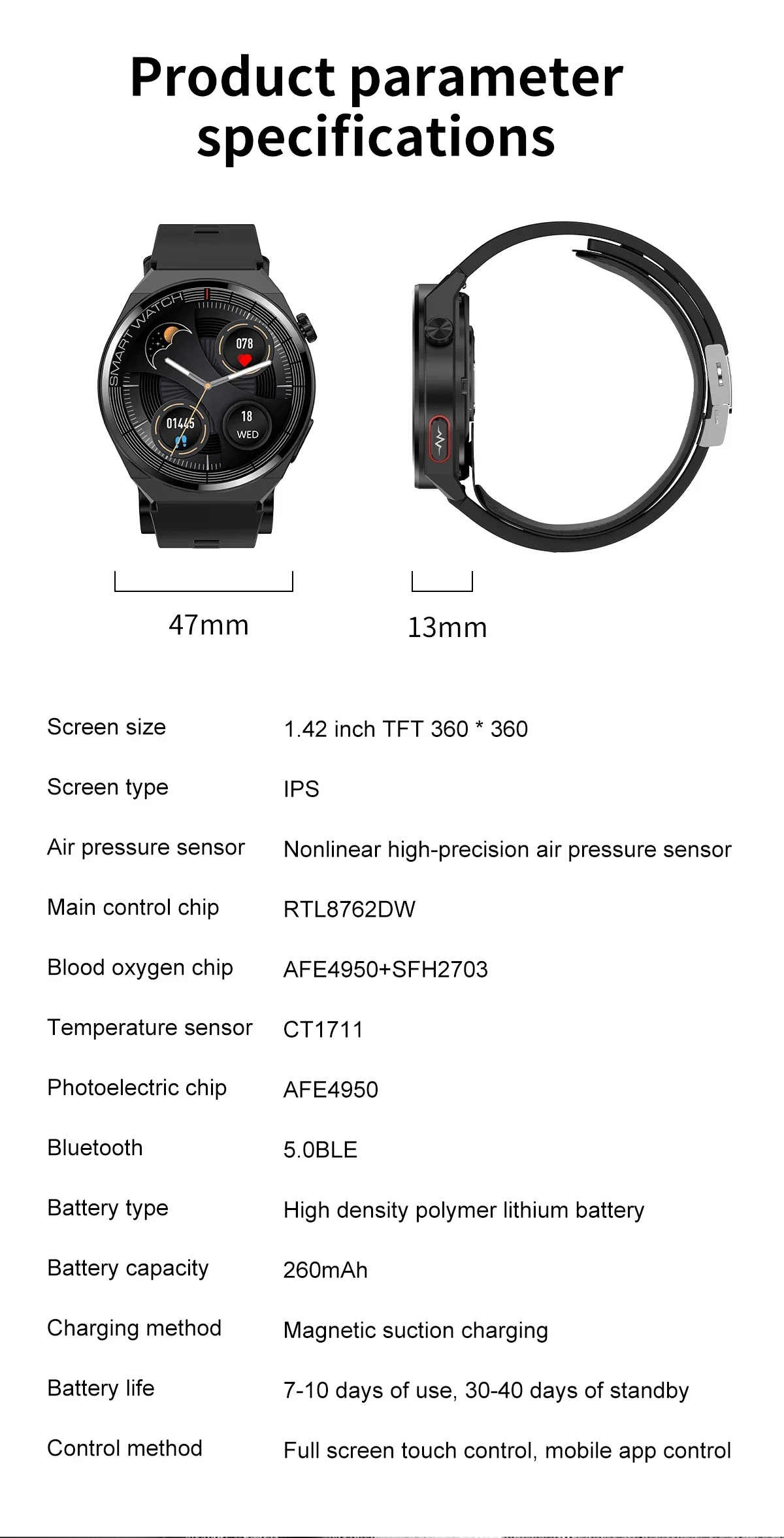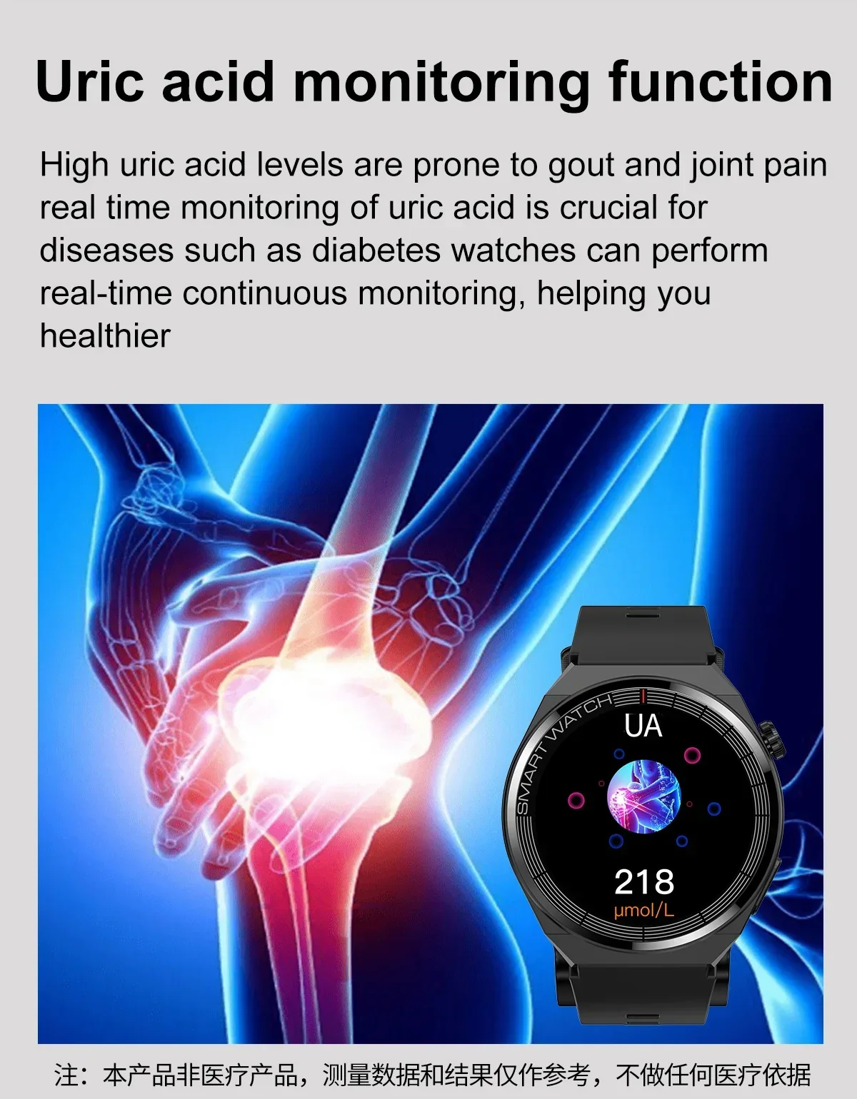 (detachable) 2. ECG electrocardiogram, AI intelligent diagnosis 3. Health management functions such as uric acid, blood lipids, body temperature, blood oxygen, respiratory rate, sleep, and sedentary reminders 4. Exercise function: step count/calorie/distance, multiple exercise modes 5. Remote family and friend care function 6. APP market multi dial switching, custom main dial, call and message reminders, weather forecast, stopwatch, music control, wrist up display, alarm clock, multiple languages 7. 1.42 inch 360 * 360 retina high-definition full touch screen |
